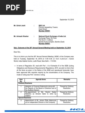 Hcltech 19092018121338 Outcomeofagm 288 Cloud Computing Sap Se